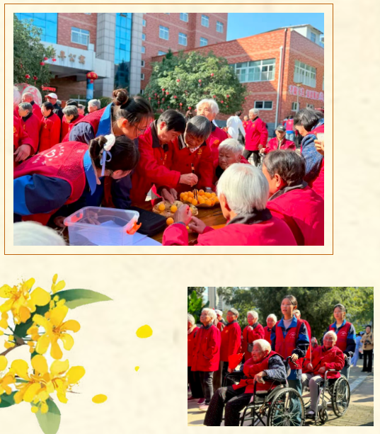 “甜蜜祝福”集体庆祝环节充满温情。志愿者们协助工作人员抬出象征长寿与祝福的重阳节大蛋糕,有序地将蛋糕分发给每一位老人。随后,全体人员齐唱《夕阳红》《歌唱祖国》《南泥湾》等节日祝福歌曲,志愿者们一边陪着老人品尝蛋糕,一边倾听他们讲述过往的故事,现场洋溢着温馨和谐的氛围。